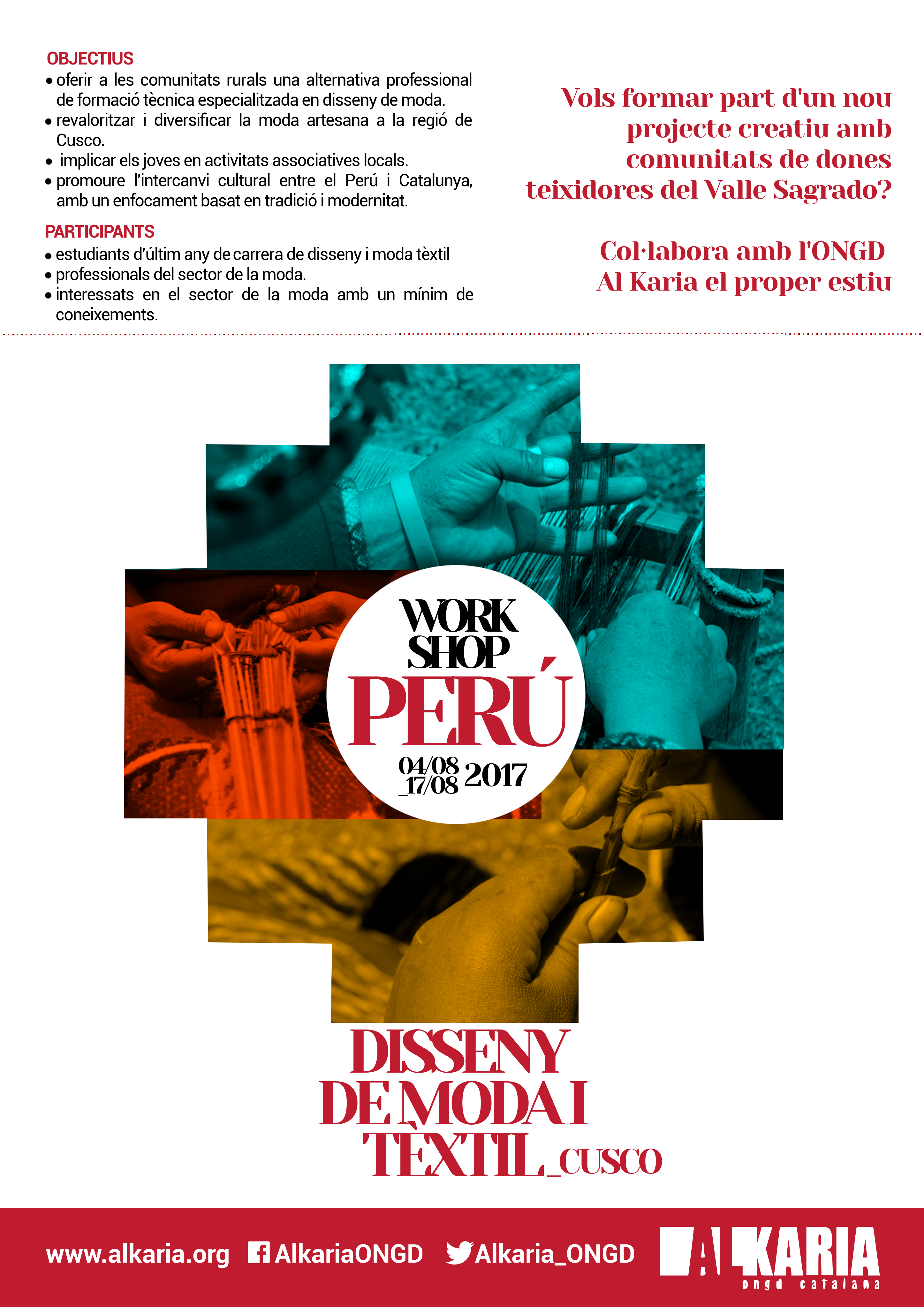 Busquem estudiants de disseny i moda tèxtil, professionals del sector o persones interessades en aquest àmbit que vulguin compartir i intercanviar coneixements amb comunitats de dones teixidores al Valle Sagrado. Si t’interessa participar-hi o coneixes algú a qui li agradaria formar-hi part, posa’t en contacte amb nosaltres a infoalkaria@yahoo.es.